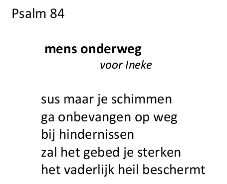 Uitdagend was het om zo met een psalm, met Bijbelse poëzie, bezig te zijn. Na die ene tanka volgden er meer. Eerst bracht ik een aantal mij bekende psalmen onder woorden in de eenendertig lettergrepen van een tanka. Niet als een samenvatting, maar ik heb in de taal van nu weergegeven wat het lezen van die psalm bij mij naar boven bracht. Daarna vroeg ik bekenden naar hun favoriete psalm om daar een tanka bij te schrijven. Veel herinneringen en emoties kwamen daarbij aan het licht.